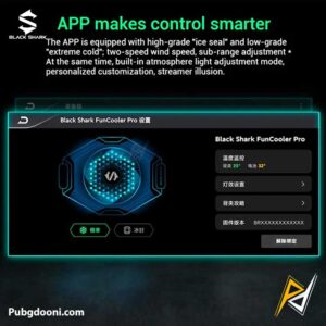 شما میتوانید با نصب اپلیکیشن Shark Kit App برای آی او اس و یا اندروید بسیاری از موارد را تنظیم کنید. شدت خنک کنندگی، افکت نوری و تعدادی دیگر از موارد را میتوانید از طریق اپلیکیشن تنظیم کنید. چراغ RGB این فن خنک کننده توربو حرفه ای بلک شارک دارای ۳۴ پترن متنوع است.