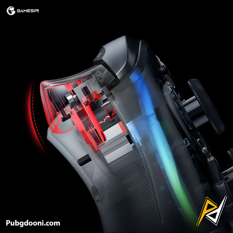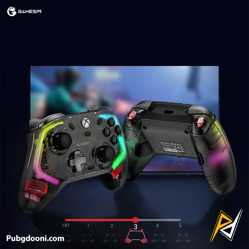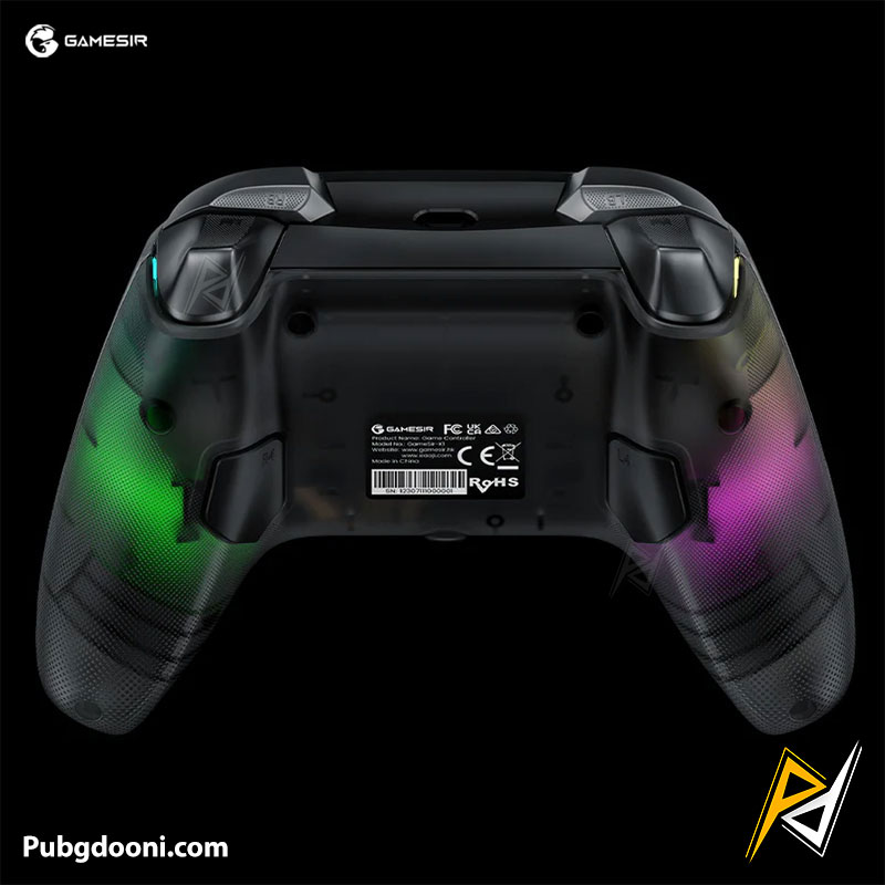 نرم افزار اختصاصی گیمسر Gamesir به شما این امکان را می دهد تا نوع نورپردازی و شدت نور دسته بازی خود را تنظیم و شخصی سازی کنید. چراغ های آر جی بی این دسته بازی قابلیت ایجاد ۱۶.۸ میلیون رنگ را دارد و می توانید با استفاده از اپلیکیشن مخصوص گیمسر، رنگ بندی و شدت نور این دسته بازی را هر طور که دوست دارید تنظیم کنید. این دسته ایکس باکس حرفه ای و با کیفیت دارای بدنه ی نیمه شفاف و طراحی بسیار زیباییست. زمانی که چراغ های این دسته روشن می شوند می توانید چراغ های این کنترلر را در داخل بدنه تعبیه شده اند ببینید.
